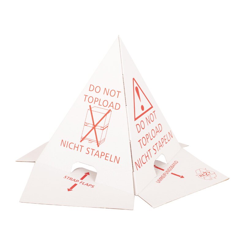 Gut braucht Hut! Zumindest sofern Sie Paletten davor bewahren möchten, dass sie übereinandergestapelt werden. Unsere Palettenhütchen in Pyramidenform dienen als optische Warnung davor und schützen so belastungsempfindliches Transportgut. Als unübersehbarer Hinweis sind die Warnkegel, auch Stapelschutzpyramide genannt, ruckzuck aufgebaut und angebracht. verhindern Transportschäden aufgestellt nicht zu übersehen mit 4-seitigem Warnaufdruck in Deutsch und Englisch sowie zusätzlichen Piktogrammen vorhandene Schlitze ermöglichen die Befestigung mit Umreifungsband platzsparend lagerbar durch flachliegende Anlieferung